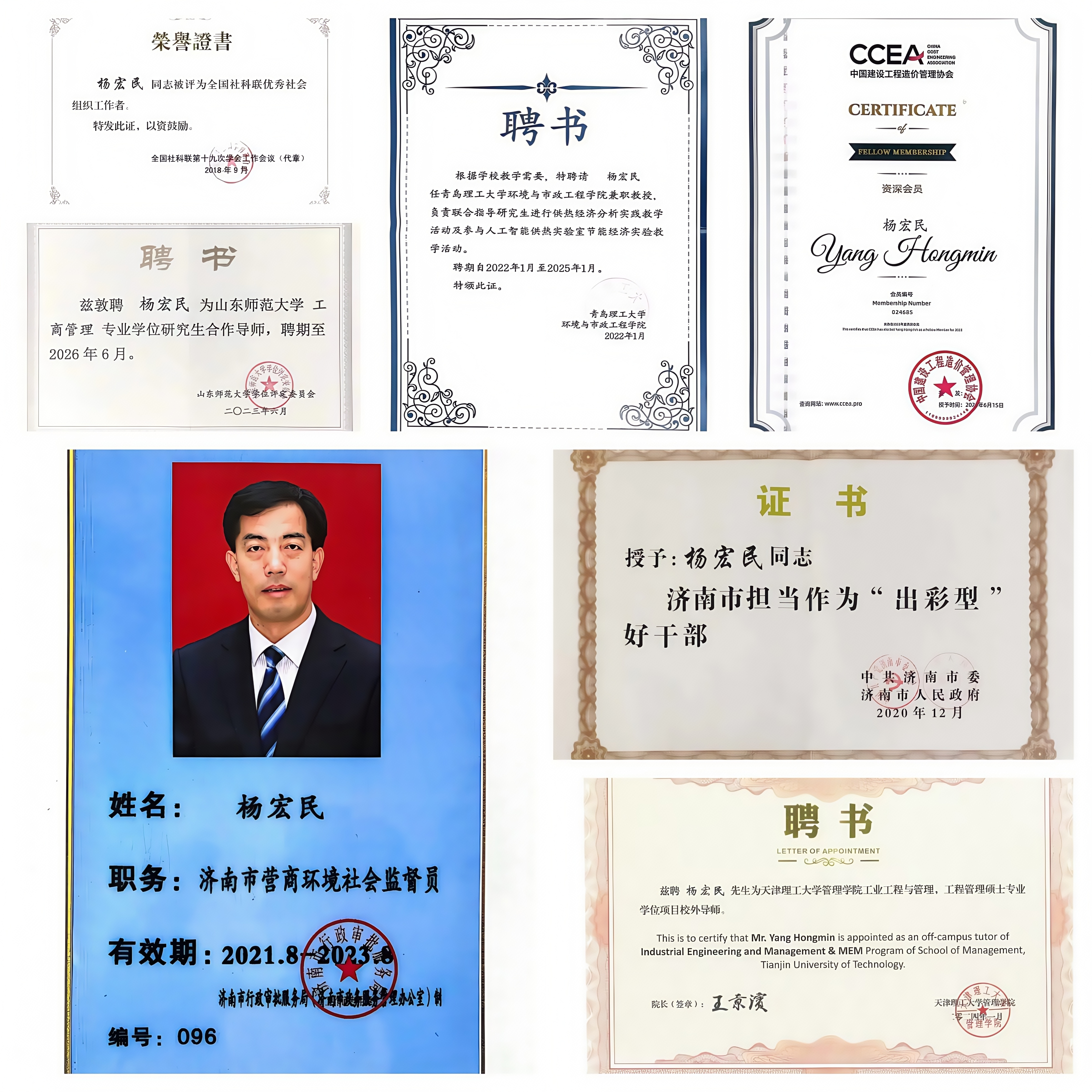 他先后被濟南市企業家協會評為第十九屆濟南市優秀企業家;被全國社科聯第十九次學會工作會議評為全國社科聯優秀社會組織工作者;被濟南市委、市政府授予濟南市擔當作為出彩型好干部稱號;被濟南市行政審批服務局聘為營商環境社會監督員;被青島理工大學境與市政工程學院聘為碩士研究生聯合指導老師;被山東師范大學商學院聘為工商管理專業研究生合作導師;被天津理工大學管理學院聘為碩士研究生校外導師。